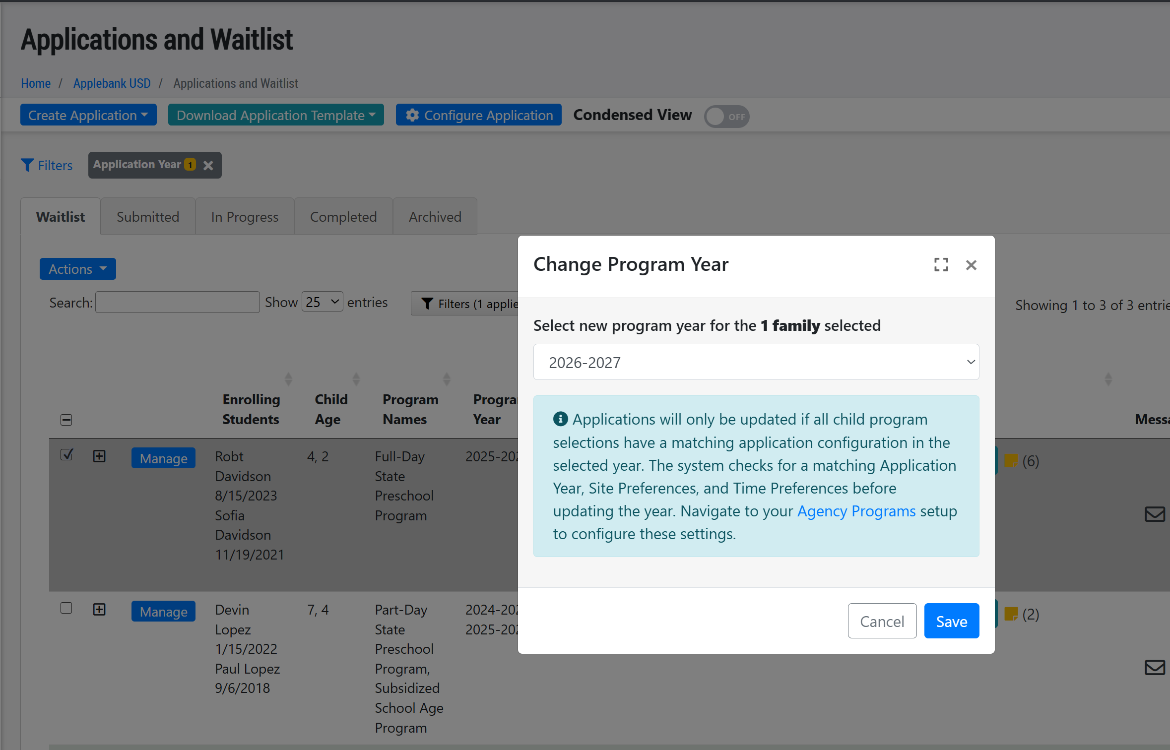 If your program has year-round applications, there is a chance some families will need to be manually moved from one application year into the next one. This article will teach you how to move waitlisted families between application years.