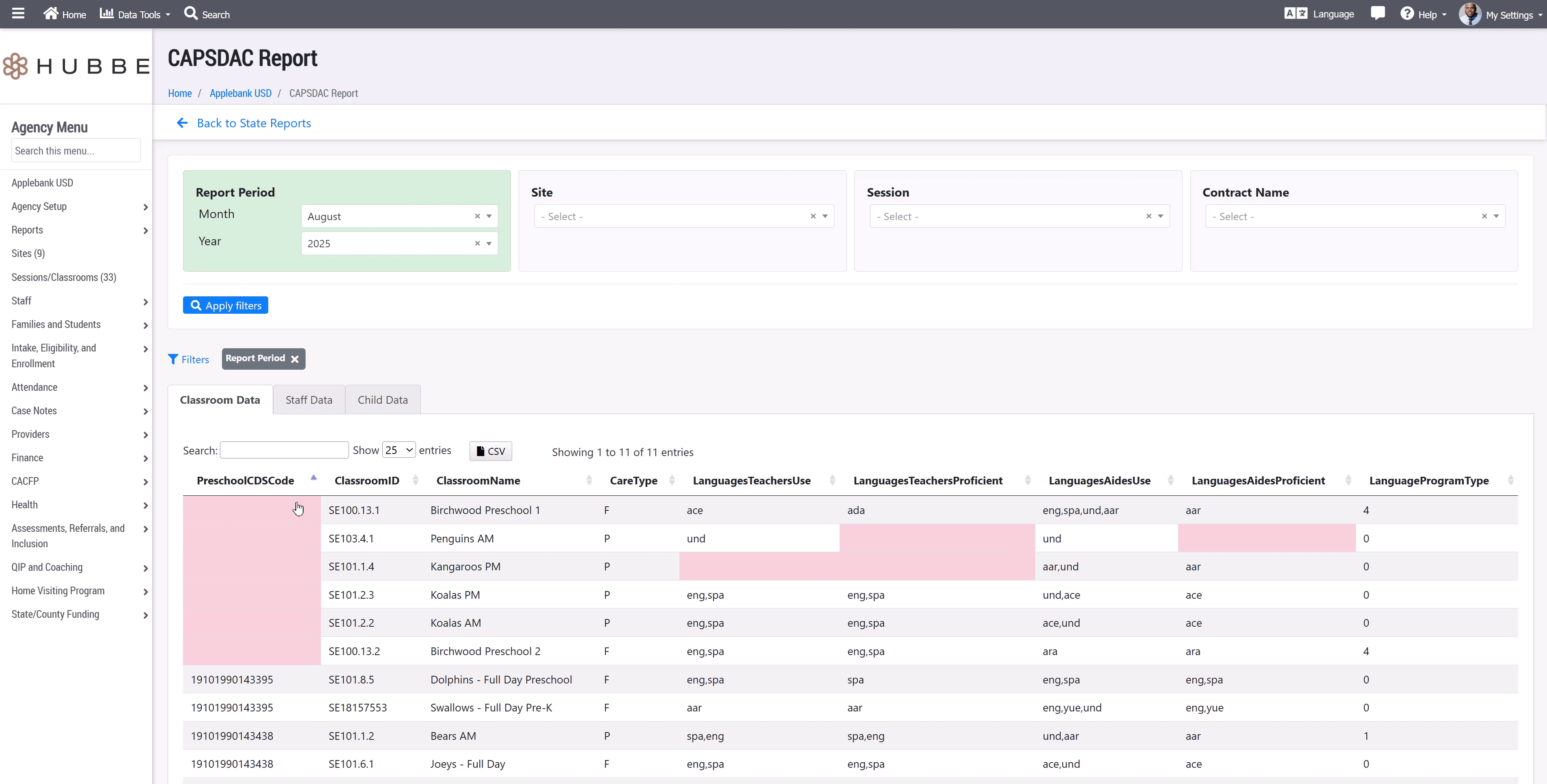 The Classroom Data report pulls data from the "Session/Classroom" records in your Hubbe system. Note that the report will only show sessions where a child was served under a California State Preschool Program (CSPP) funding contract. If there were no CSPP children served in a session/classroom for a month, that session will be omitted from the report for that month.