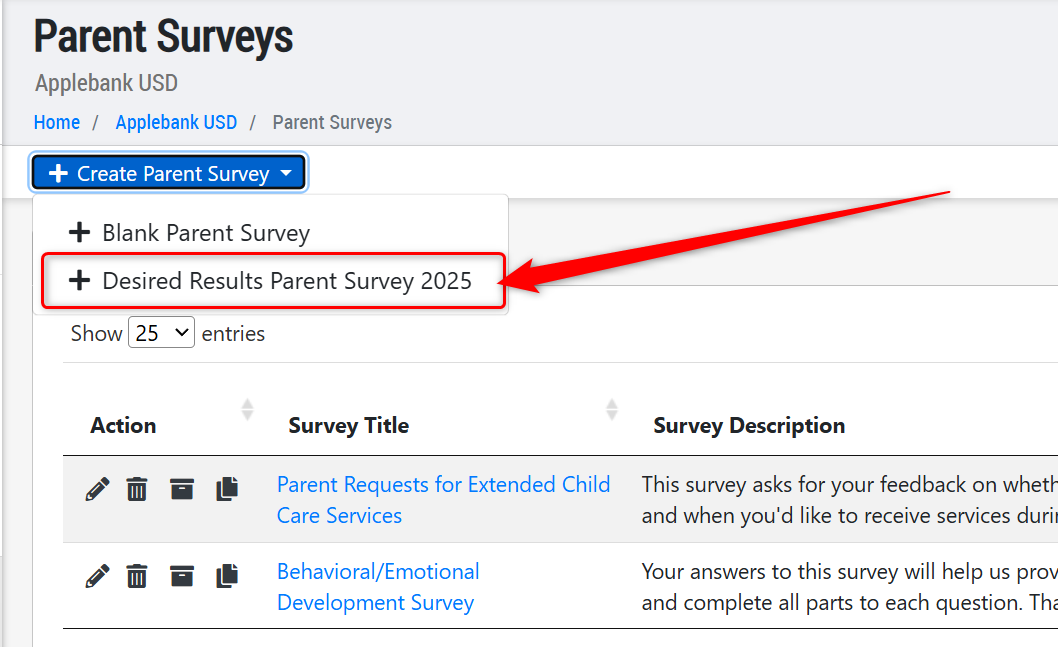 - We are happy to share that we've created the new Desired Results Parent Survey 2025 as an updated survey template. To create the DRDP 2025 survey, navigate to: Agency Menu > Families and Students > Parent Surveys. Click "Create Parent Survey" and select the "+ Desired Results Parent Survey 2025" option. This will automatically create all 25 questions in the survey, with informational statements preceding questions 1, 22, and 24. We hope this helps your team collect this annual survey information!
