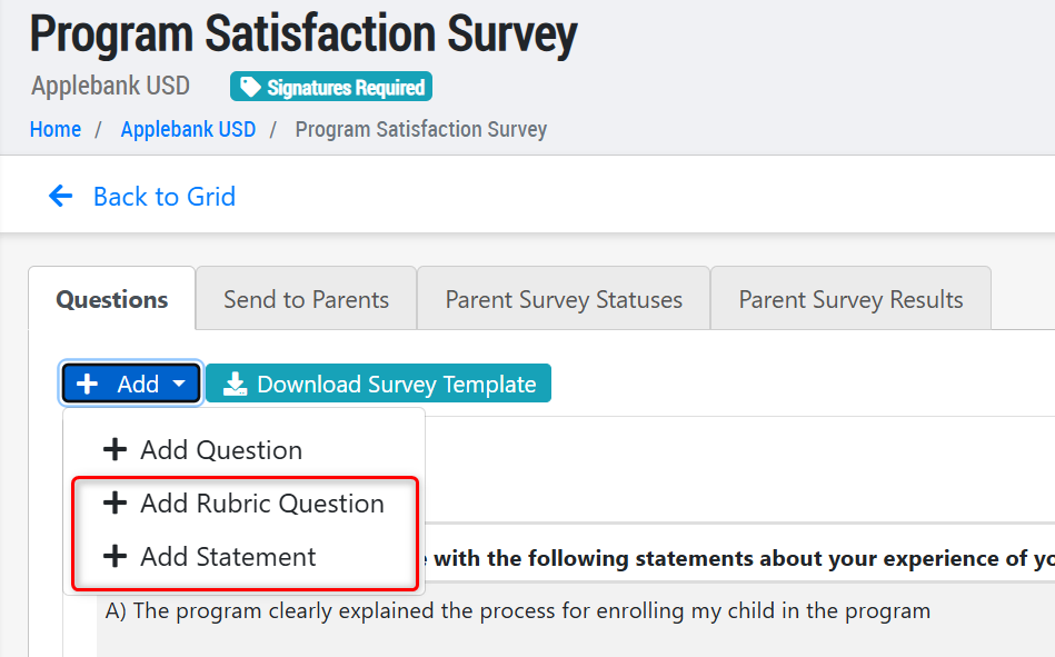 - Rubric Question - Added a new question type called "Rubric Question." This allows users to create a question with as many sub-questions as needed, all with the same response format. For example, the main question and response types can be: Q - Rate to what extent you agree with the following statements about your experience of your child’s program, A - Strongly Agree, Somewhat Agree, Somewhat Disagree, Strongly Disagree, Unsure. Then, your sub-questions can be more detailed, such as: The program clearly explained the process for enrolling my child in the program, The program shares information on the curriculum and learning activities with me, etc.
