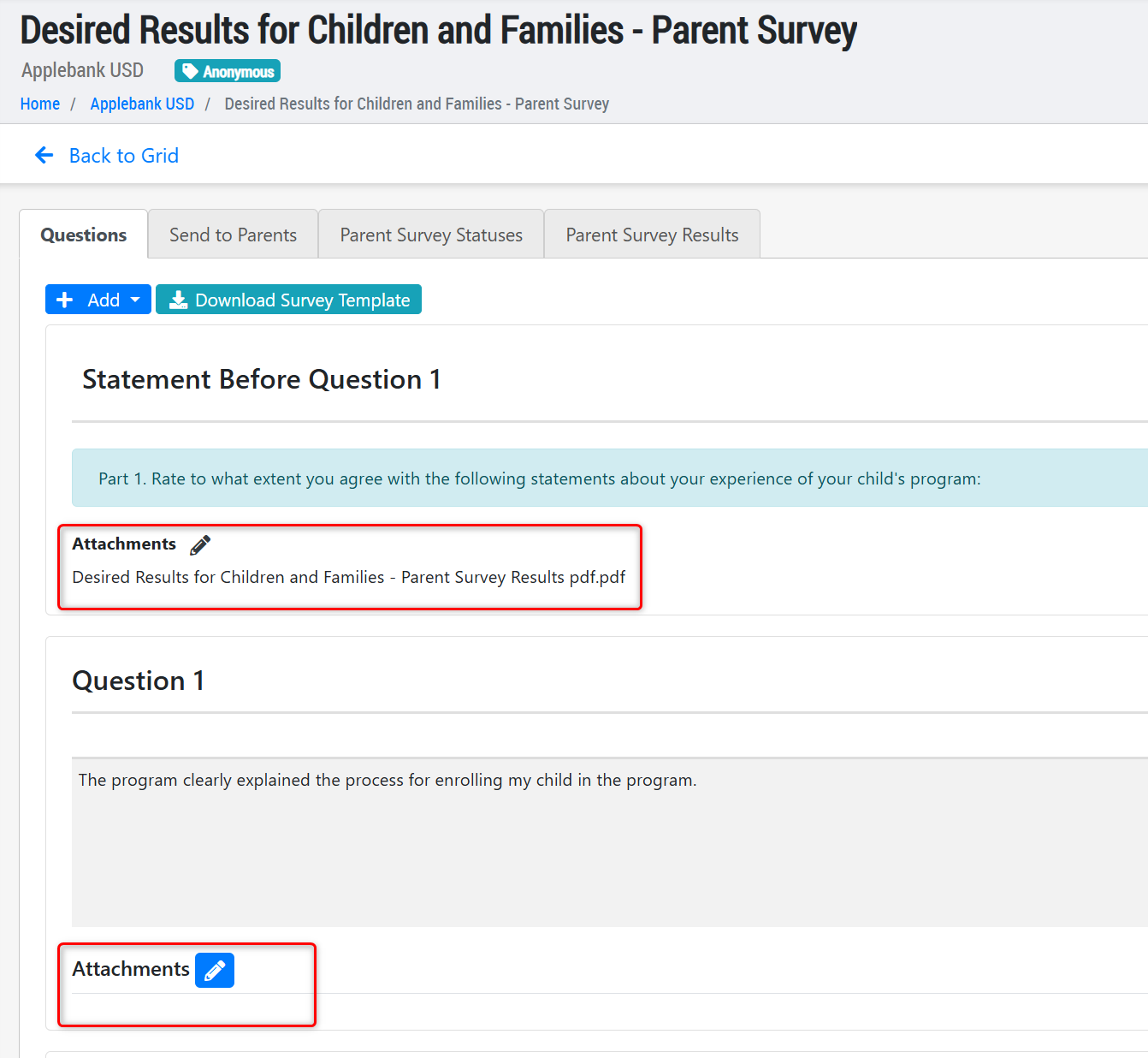 - Attachments - Added the ability to add attachments to statements and questions within the survey. When completing the survey, parents will be able to view/download any attachments added to the statement or question.