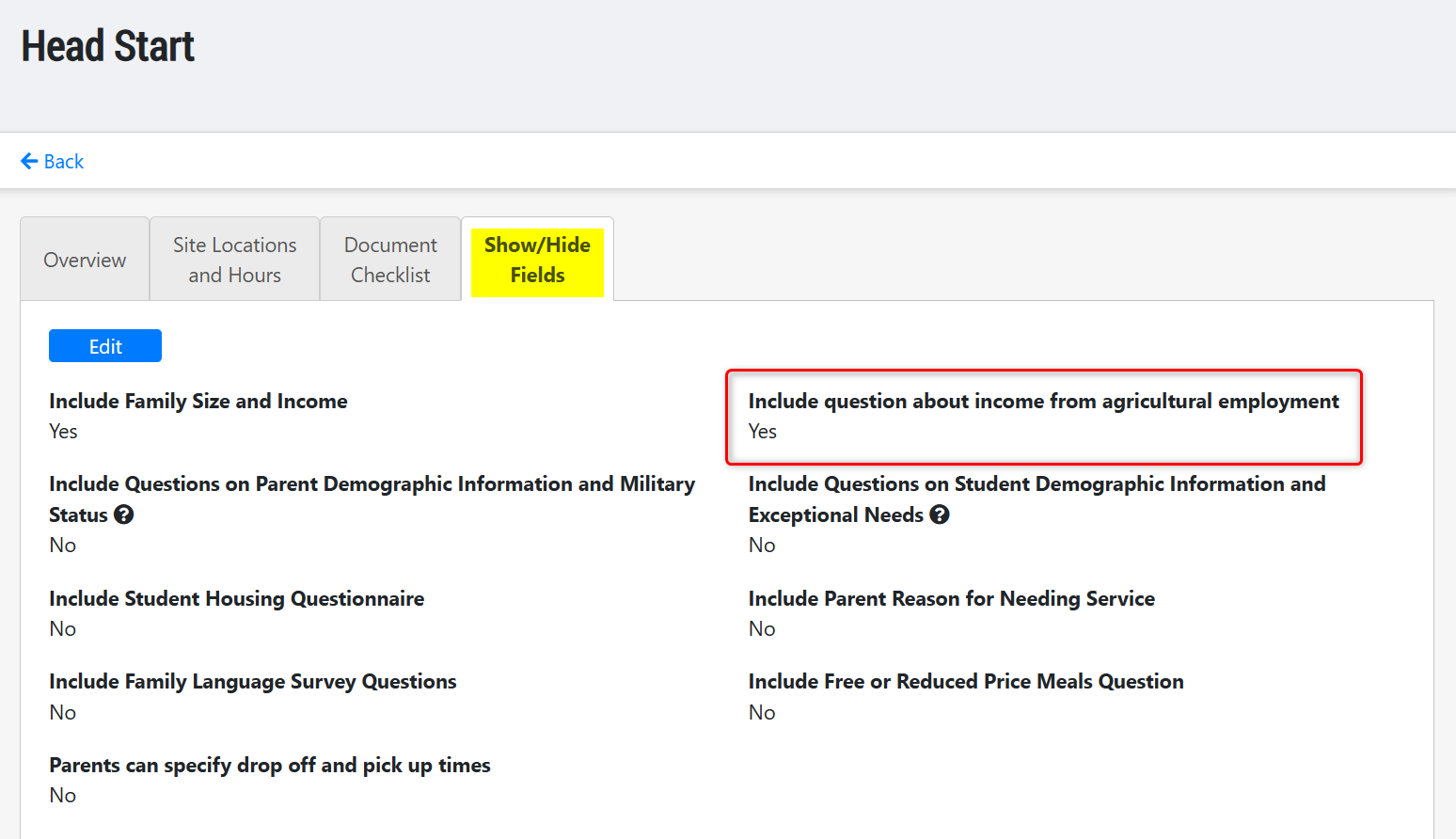 - Click on the "Show/Hide Fields" tab, set the field titled "Include question about income from agricultural employment" to "Yes."