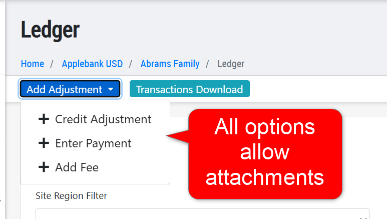 - We have added a new "Attachments" feature to family fees and payments/credits. Now, when users add payments, credits, or non-scheduled fees to a family's ledger, they can add attachments to the transaction, such as a copy of a check or receipt. The attachments will be available from the General Ledger, Family Ledger, and Payments Report.