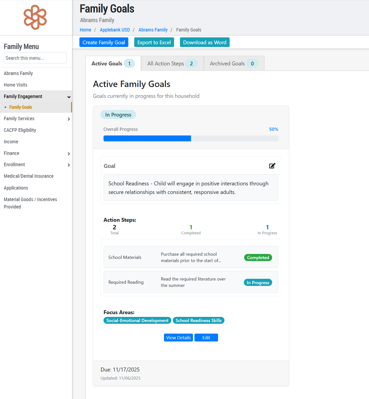 - The feature previously titled Family Action Plans has been renamed to Family Goals, which contain action items and focus areas within each goal. We have also updated the Family Goal feature within Hubbe to be more user-friendly and visually consistent with the other areas of the system. Now, select agency staff can more easily create, edit, and manage Family Goals in Hubbe. To navigate to this area: Family Menu > Family Engagement > Family Goals. We hope you enjoy the newly improved Family Goals feature!