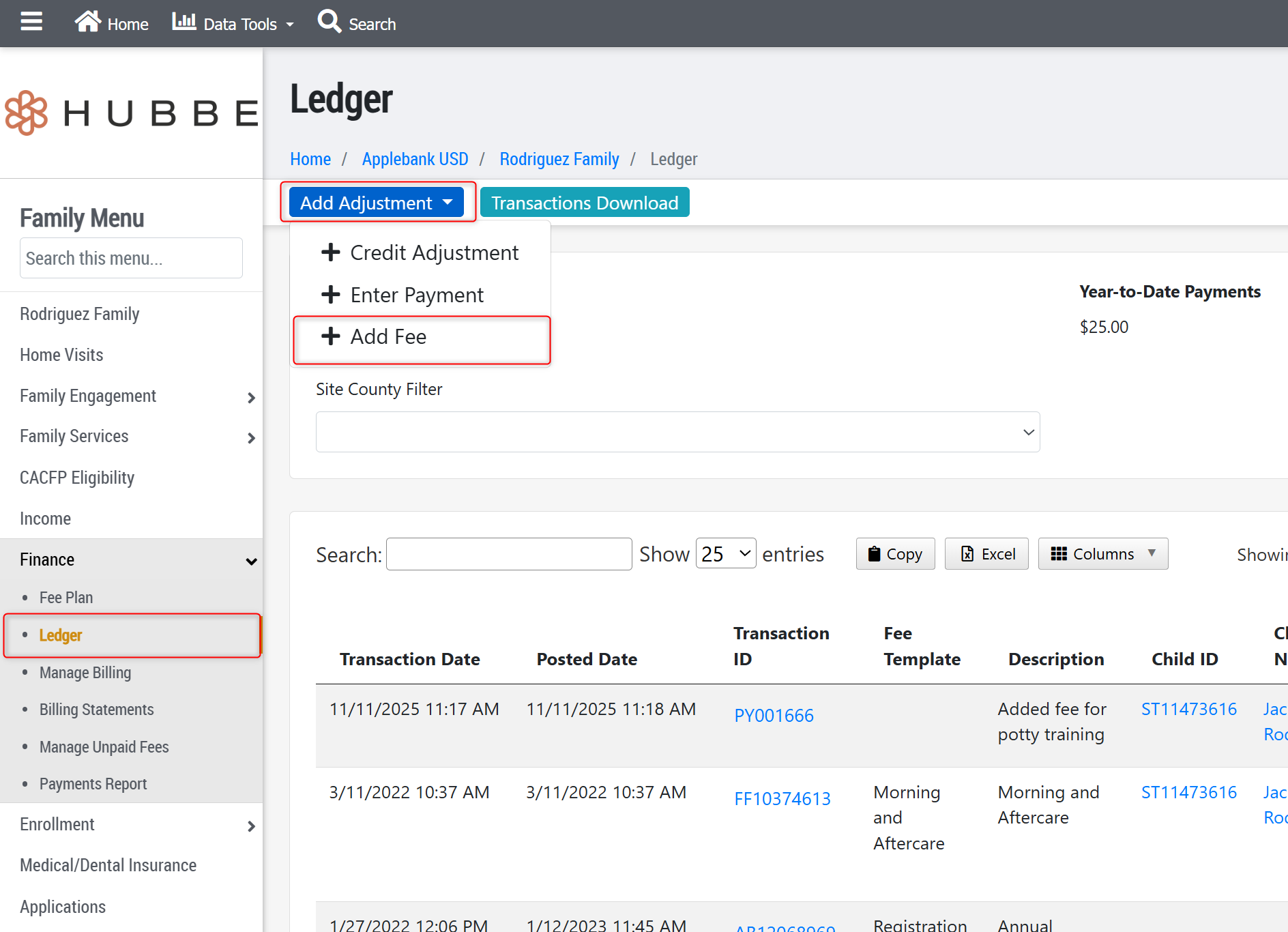 - Navigate to the family's "Ledger" record (Family Menu > Finance > Ledger)