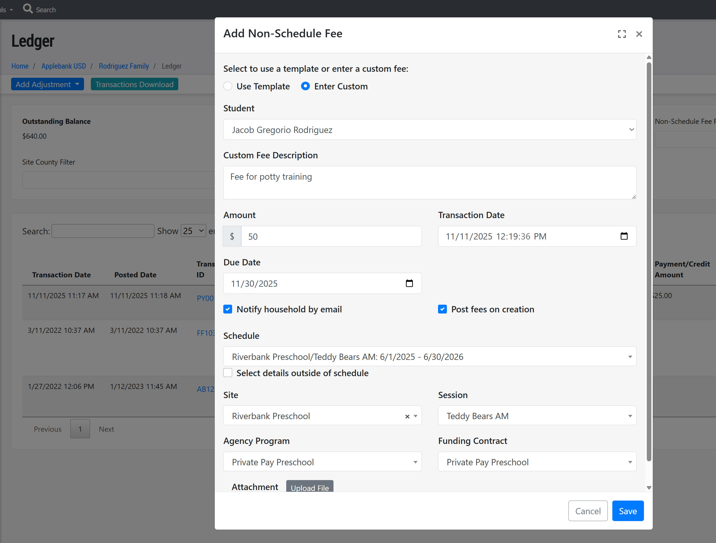 - Schedule - This will prefill with the schedule for the chosen student in the family. If the child has more than one schedule, you can change the selection if needed. The schedule chosen will appear in the ledger attached to the fee.