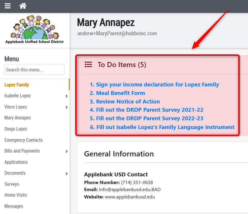 In this article, we will show how to complete any To Do Items inside of the parent portal. This items are often time-sensitive and warrant action as soon as you login to the parent portal. here is a sample list of To Do items from our demo system. Your To Do Items will look different than these ones shown below: