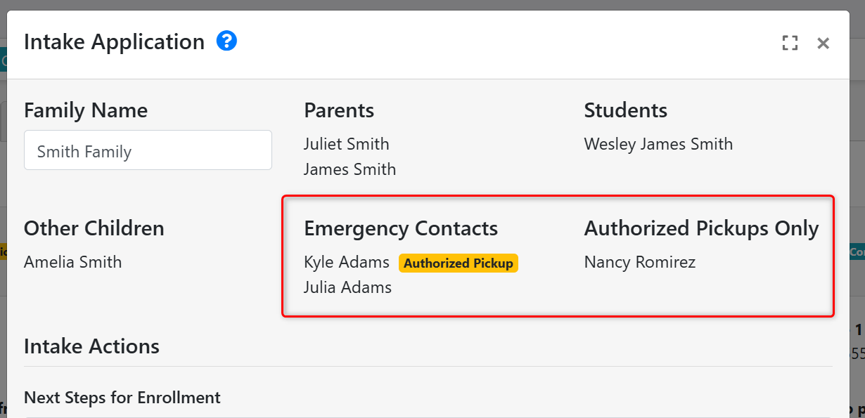 - In the "Intake Application" modal when intaking a family from your Waitlist, there are two sections for "Emergency Contacts" and "Authorized Pickups." We have added badges beside the Emergency Contacts who are authorized to pickup the child, and re-labeled the other section to "Authorized Pickups Only." This update aims to distinguish these two lists from each other, as they are separate record types - one for individuals who can be contacted in the event of an emergency (and can be marked as authorized to pickup, as well), and the other as individuals who are only authorized to pickup the child from care.