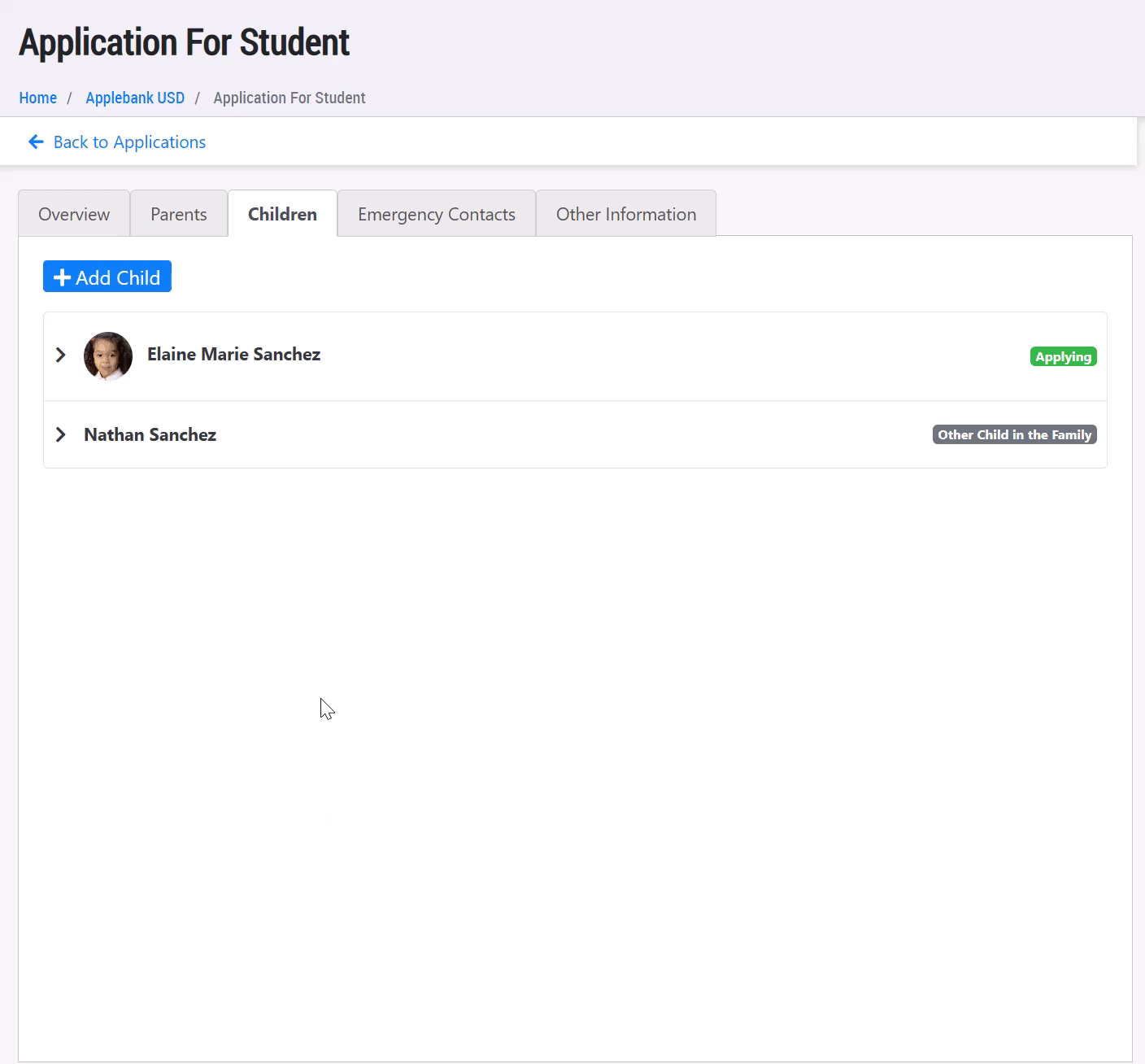 - Previously, the "Child Addition" application type would only include the children that the parent selected as applying when creating the application, as requested by users when being developed. However, we have updated this process to match the existing re-application model.