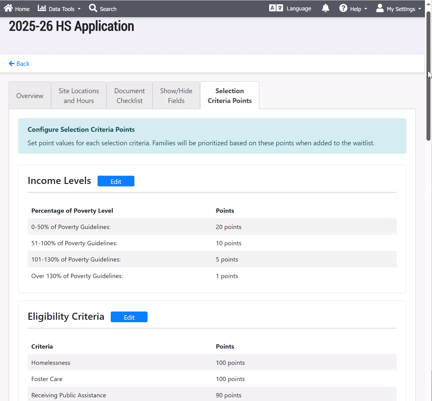 - Setup: We've added a "Configure Selection Criteria Points" tab within the application settings area for any Agency Program with "Head Start" selected as its program type. Here, users can enter points values for any and all eligibility criteria, such as Income Levels, Disabilities, Child Age, Tribal Programs, Migrant Programs, and more. Users can also associate point totals with custom criteria based on the community their agency serves. Once any point value is assigned to a criteria, then any applicant who is eligible for that criteria will have those points added to their overall "Head Start Criteria Points" value in their application.