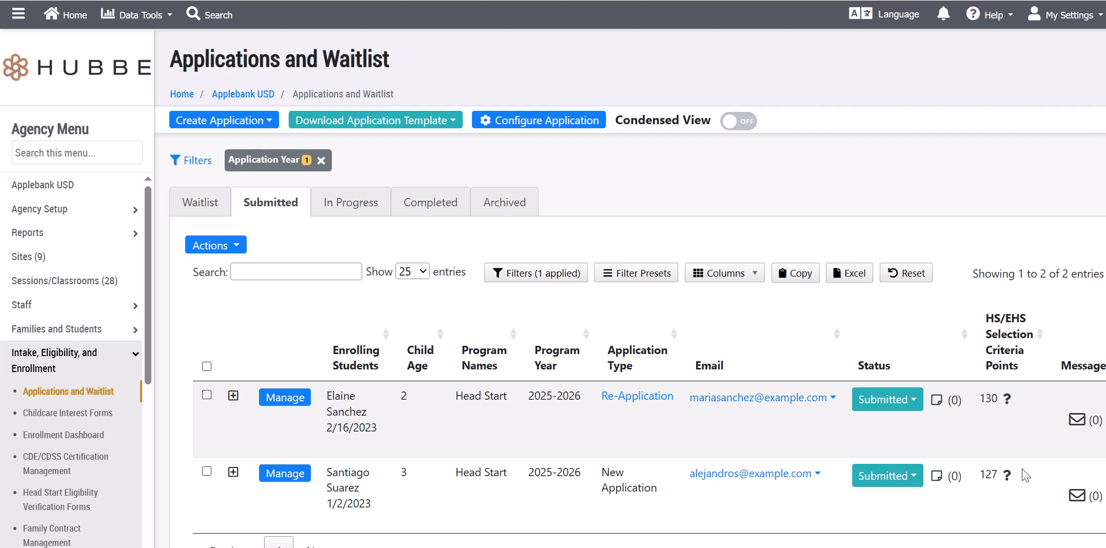 - Family Application: The Applications & Waitlist grid features a new column titled "Head Start Selection Criteria" that will display the family's point total based on the information provided in the application. This column will be available to select as a column in the grid from the "Head Start" column cluster. The family's point value will also be available to view within the "Overview" tab of the application.
