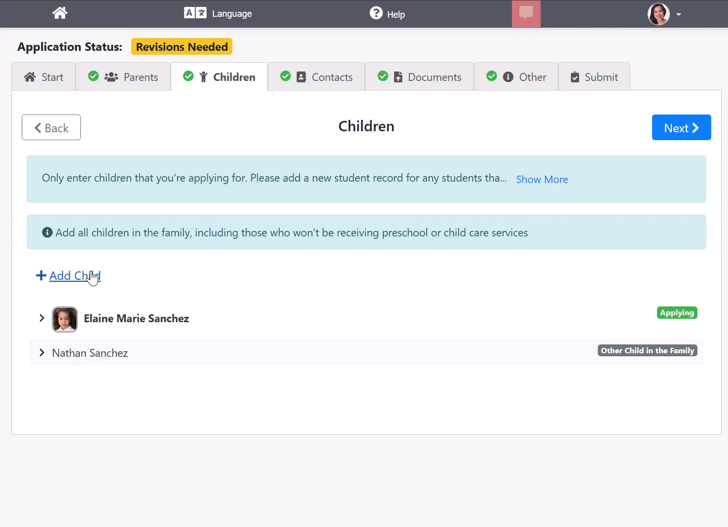 - The tab previously titled "Students" will now be titled "Children" and will include all children in the family, including those who are applying for services and those who are not. This means that the "Other Children" tab has been merged into this single tab.