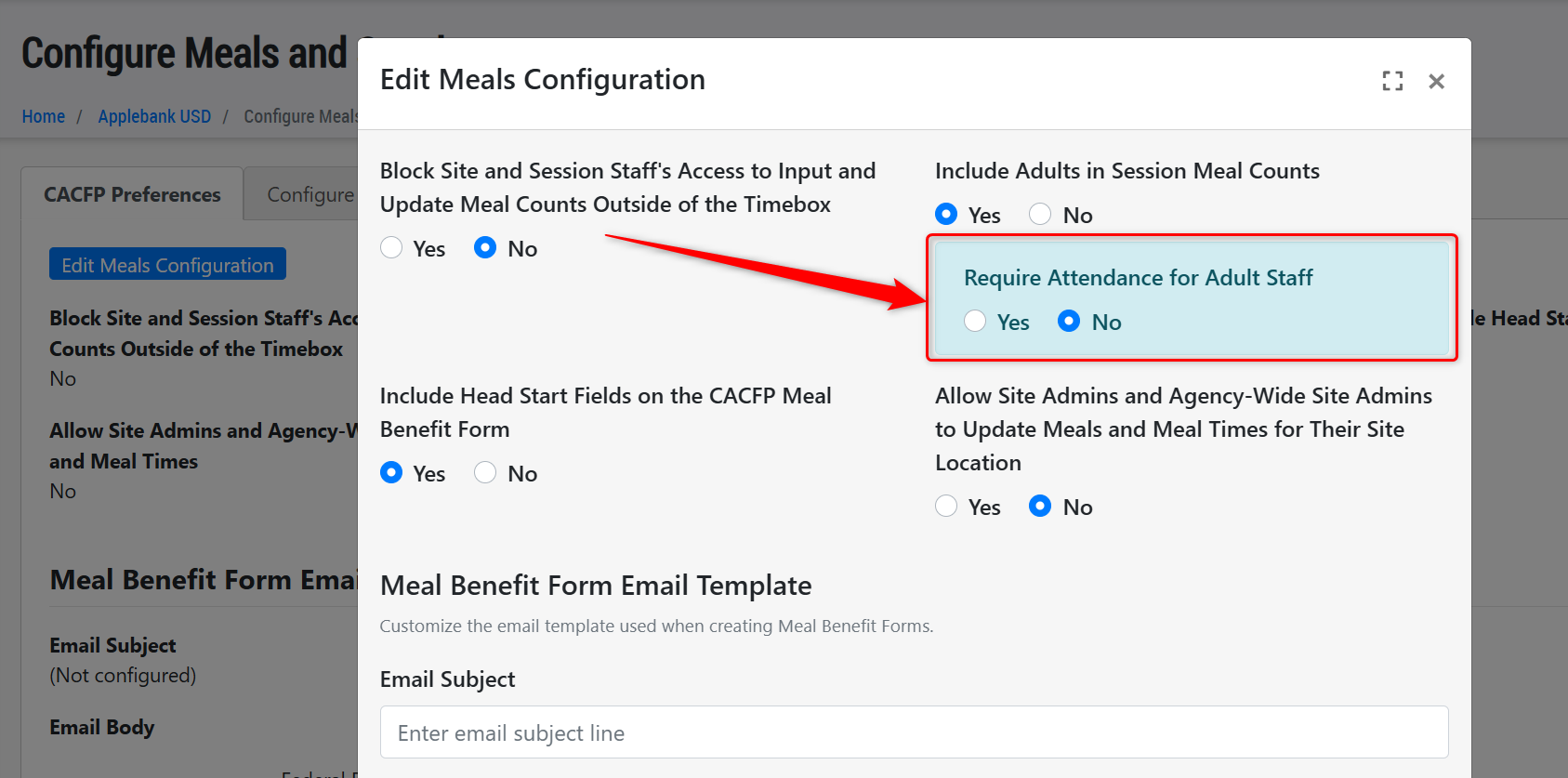 - Added a new setting to the Configure Meals and Snacks area to allow users to select whether they want to require staff attendance in the Meal Count cards. This new setting will be a sub-setting for the one titled "Include Adults in Session Meal Counts" and will be titled "Require Attendance for Adult Staff."