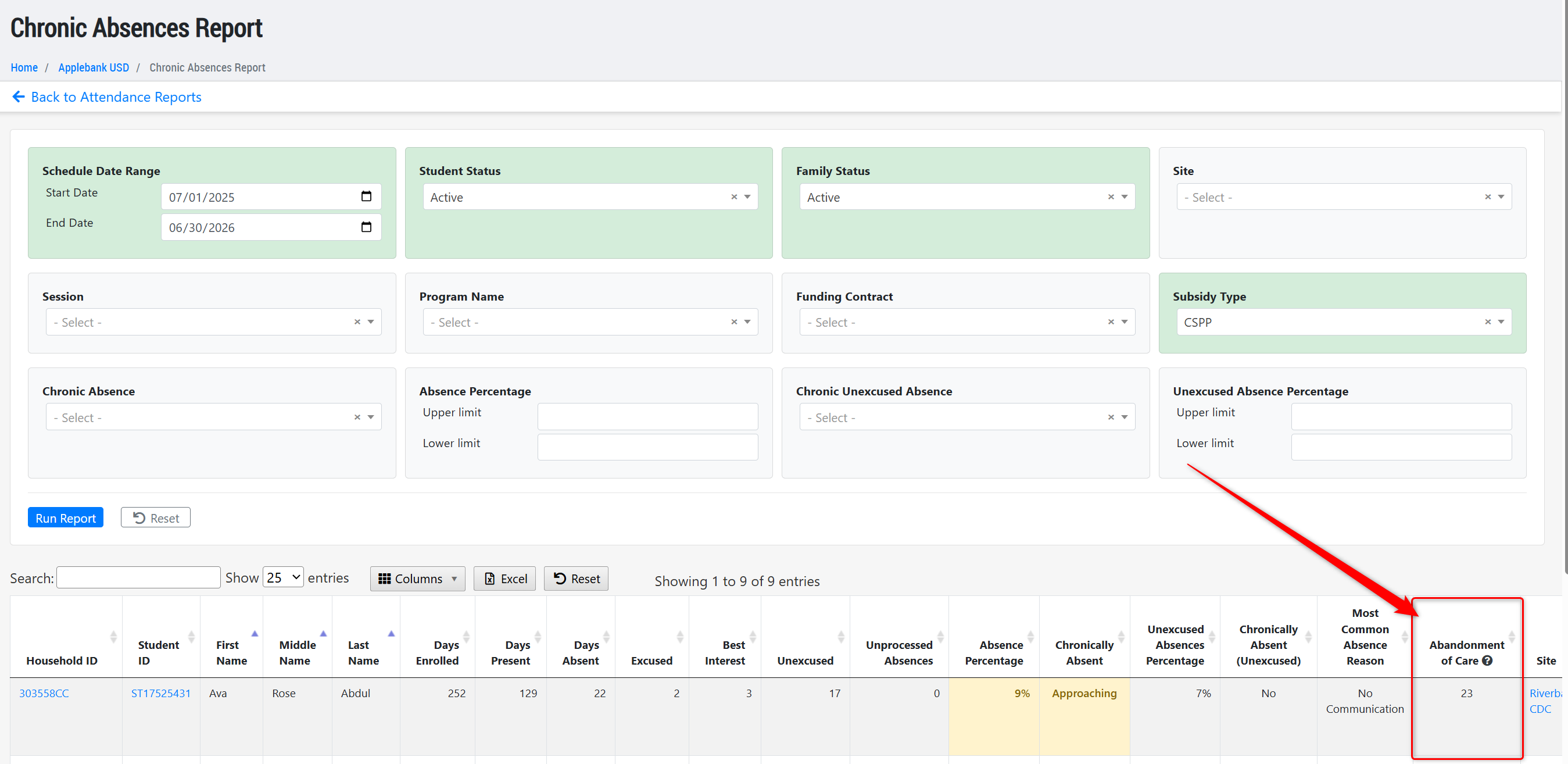 - Updated the column previously titled "Current Consecutive Unexcused Absences" to now be "Abandonment of Care" in the grid and Excel download.