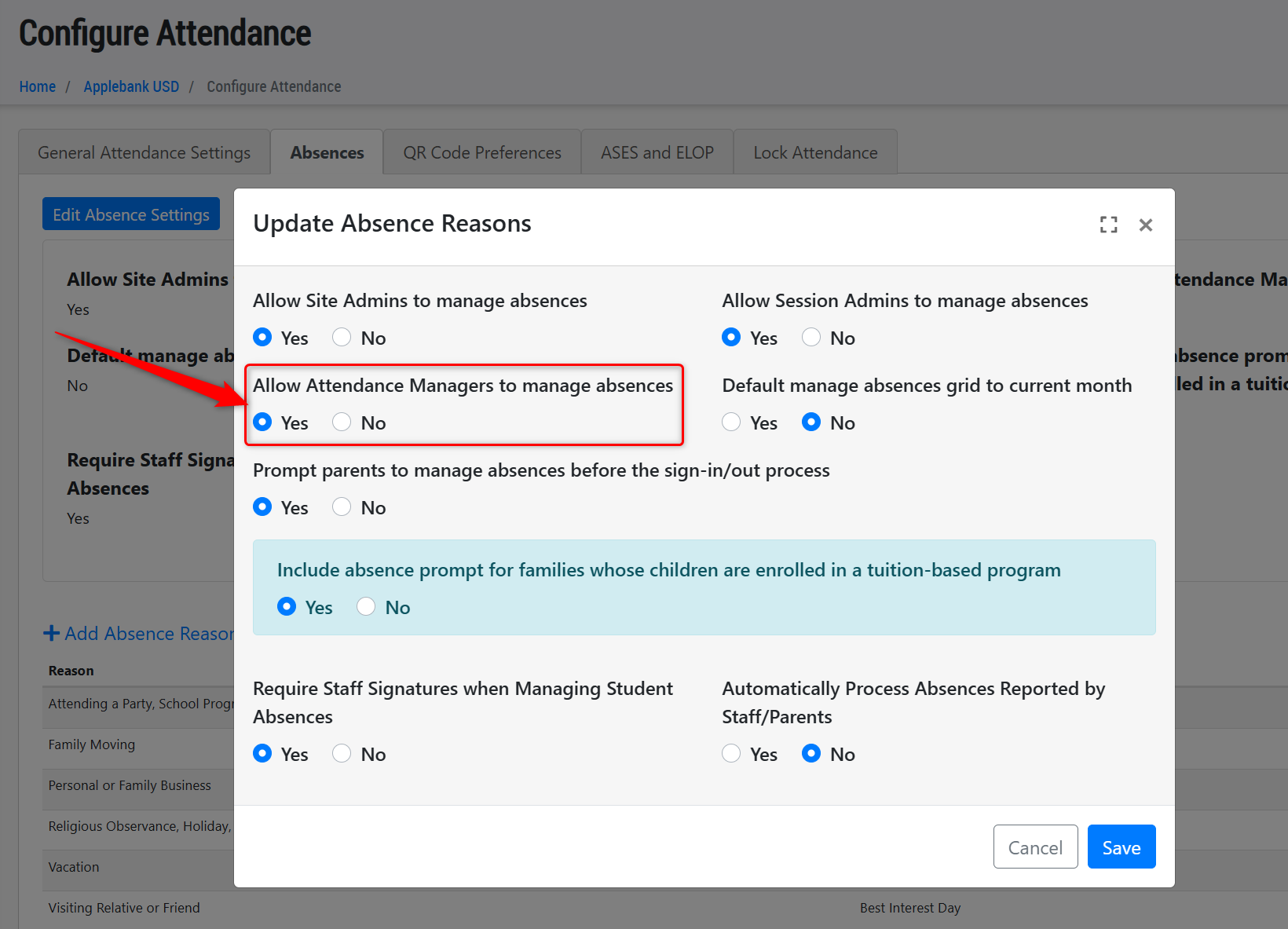 - Created a new setting in Configure Attendance > Absences titled "Allow Attendance Managers to manage absences." This setting will allow users to determine whether staff with the role of Attendance Manager can manage absences for children in their session.
