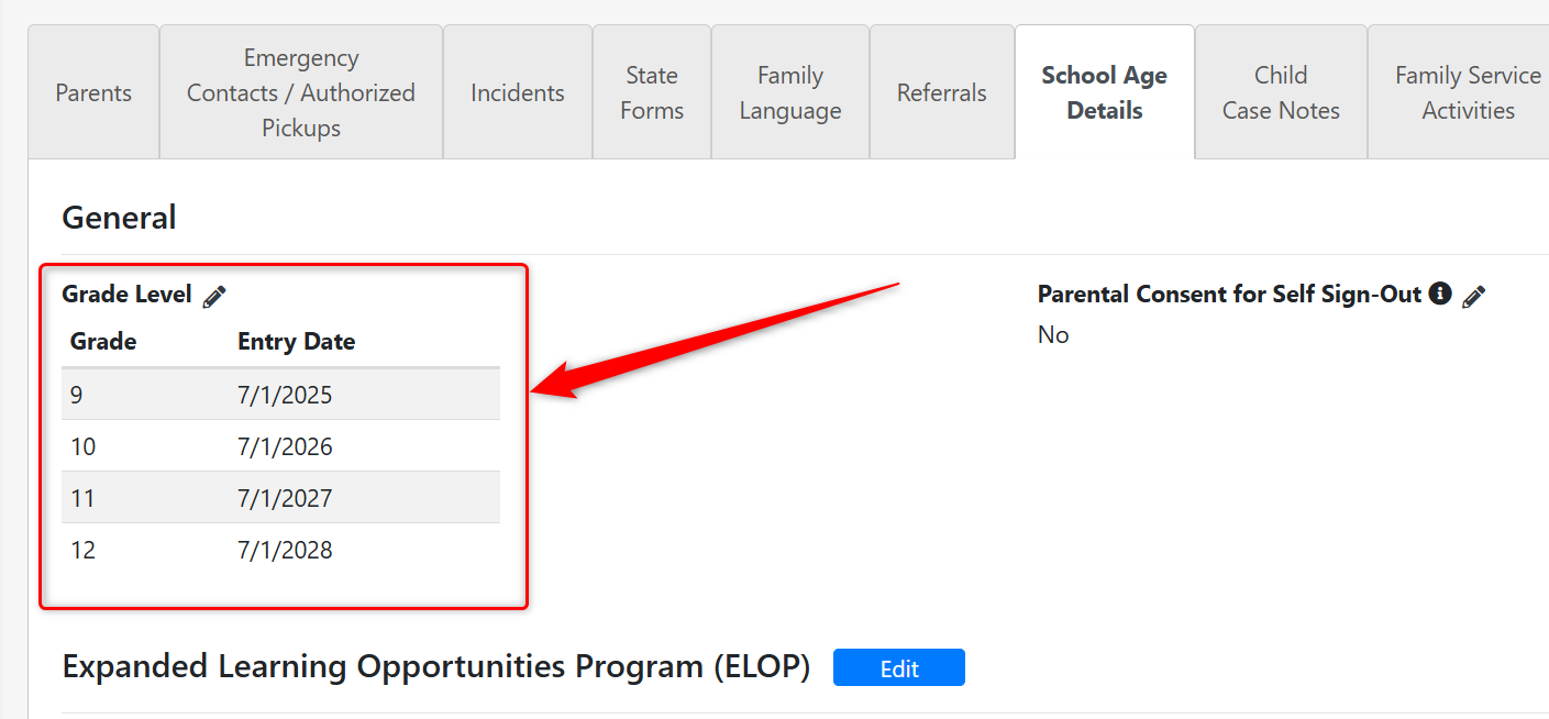 - Added grades 9 - 12 in the "Grade Level" field within a Student Record to support programs accepting high school students. These new grade levels have also been added to the "Enrollment Counts by Grade Level" report available within the Enrollment Dashboard.