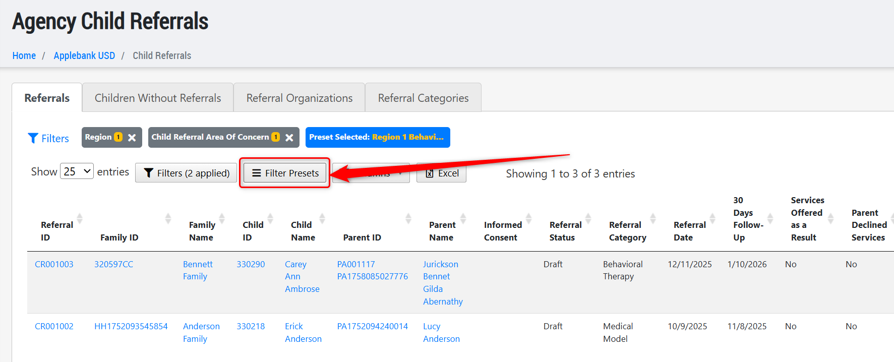 - Added the Filter Presets tool to the Child Referrals and Parent Referrals grids at the agency, site, and session levels. This will allow users to save various filter presets that can be easily applied to the grid.