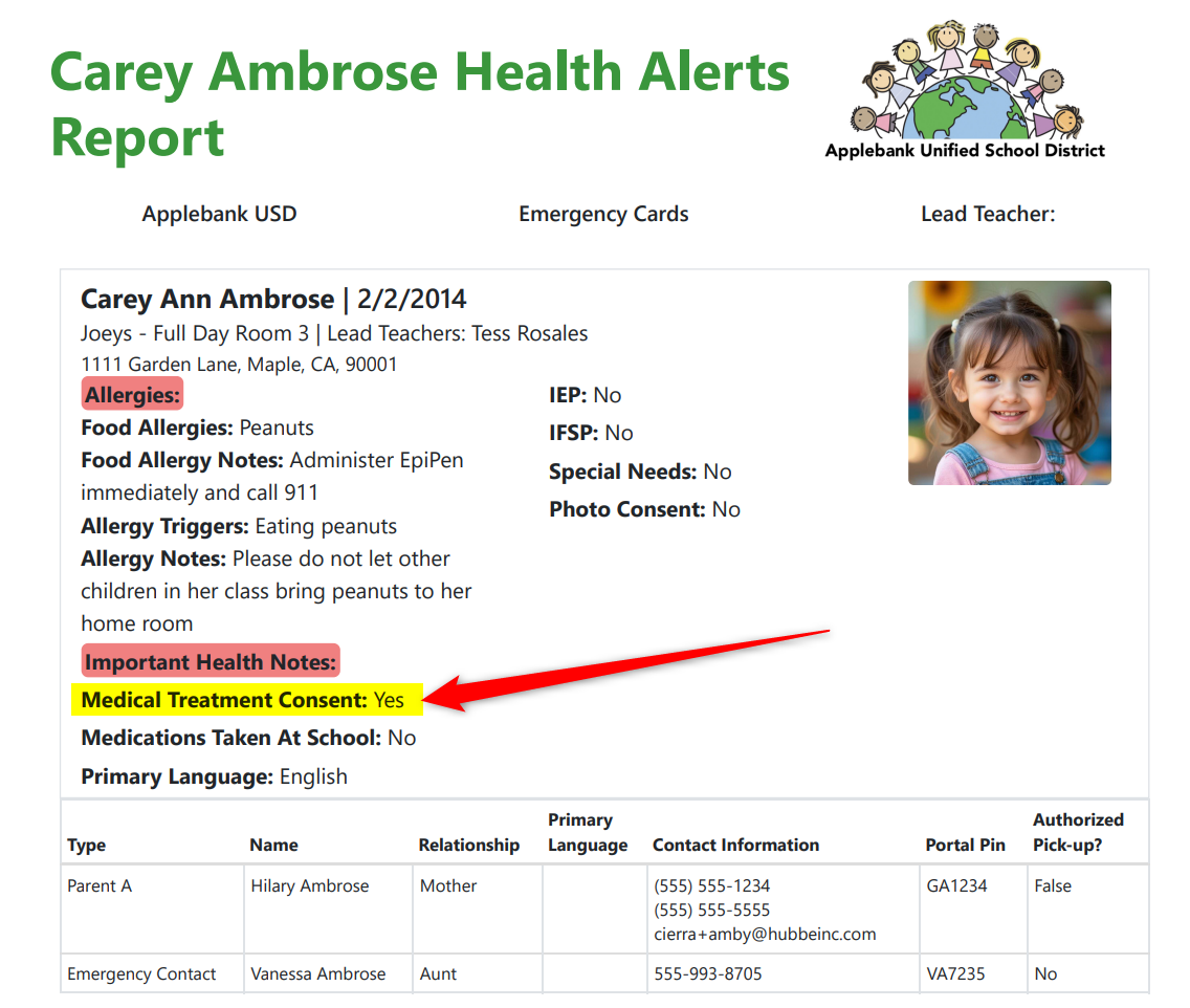 - Added a new field to the student Emergency Card download for "Medical Treatment Consent." If the child has the State Licensing Form "LIC 627: Consent for Emergency Medical Treatment" created and signed by the parent, then this field will show as "Yes" on the download - otherwise, it will show as "No."
