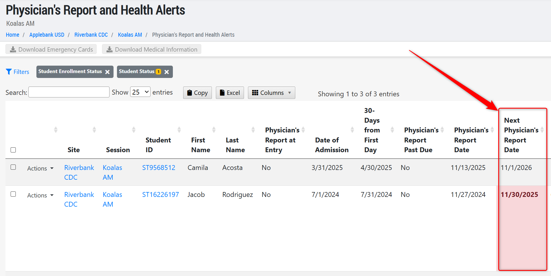 - Added a new column to the Physician's Report and Health Alerts grid at all levels, titled "Next Physician's Report Date." This column will pull the date from the child's latest Physical Screening record from the "Next Exam" field. If the date is in the past, it will be shown in red, like the other dates on this grid when past due.