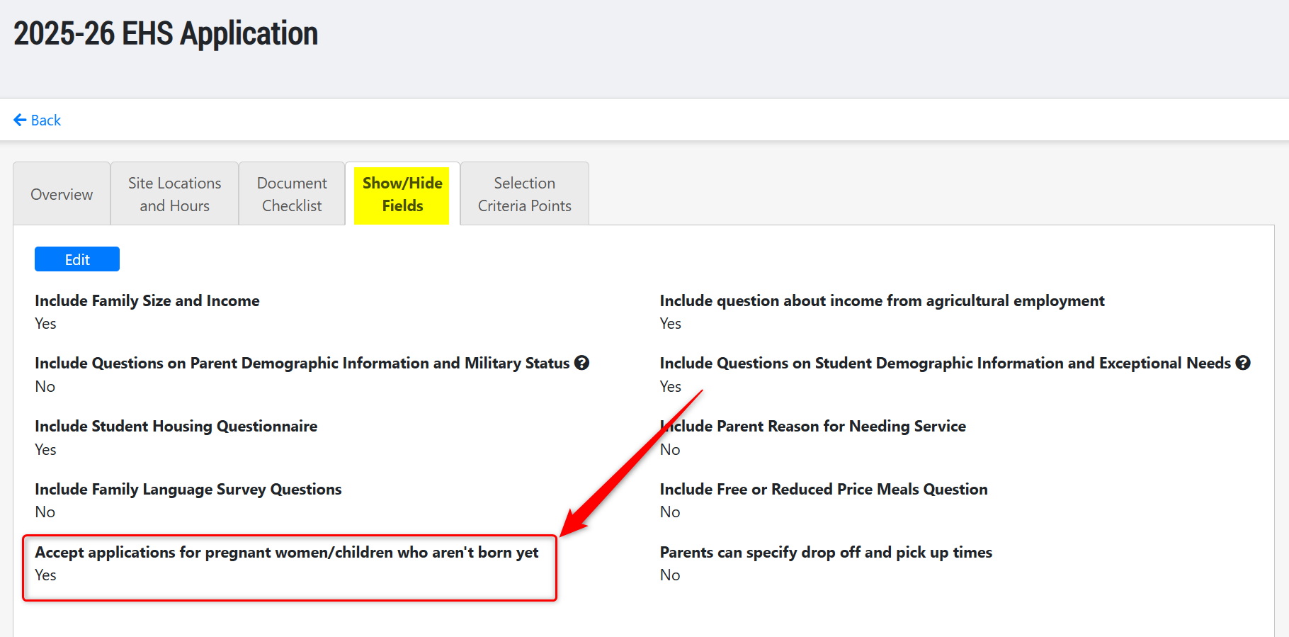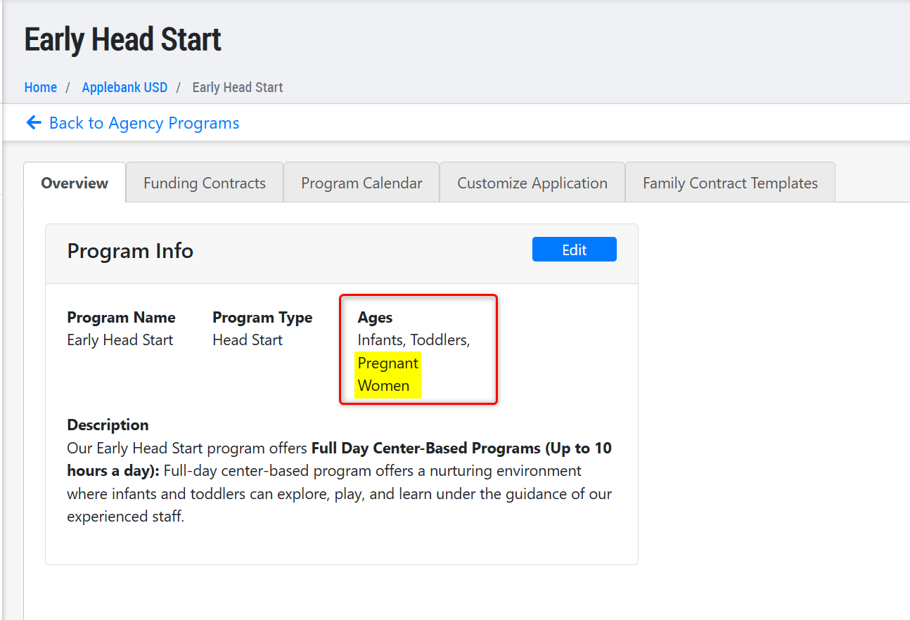 - To configure this in your Family Application, you must first select "Pregnant Women" as a category for "Age Groups Served" for an Agency Program, and then select "Yes" for the setting "Accept applications for pregnant women/children who aren't born yet" in the application settings for the Agency Program.