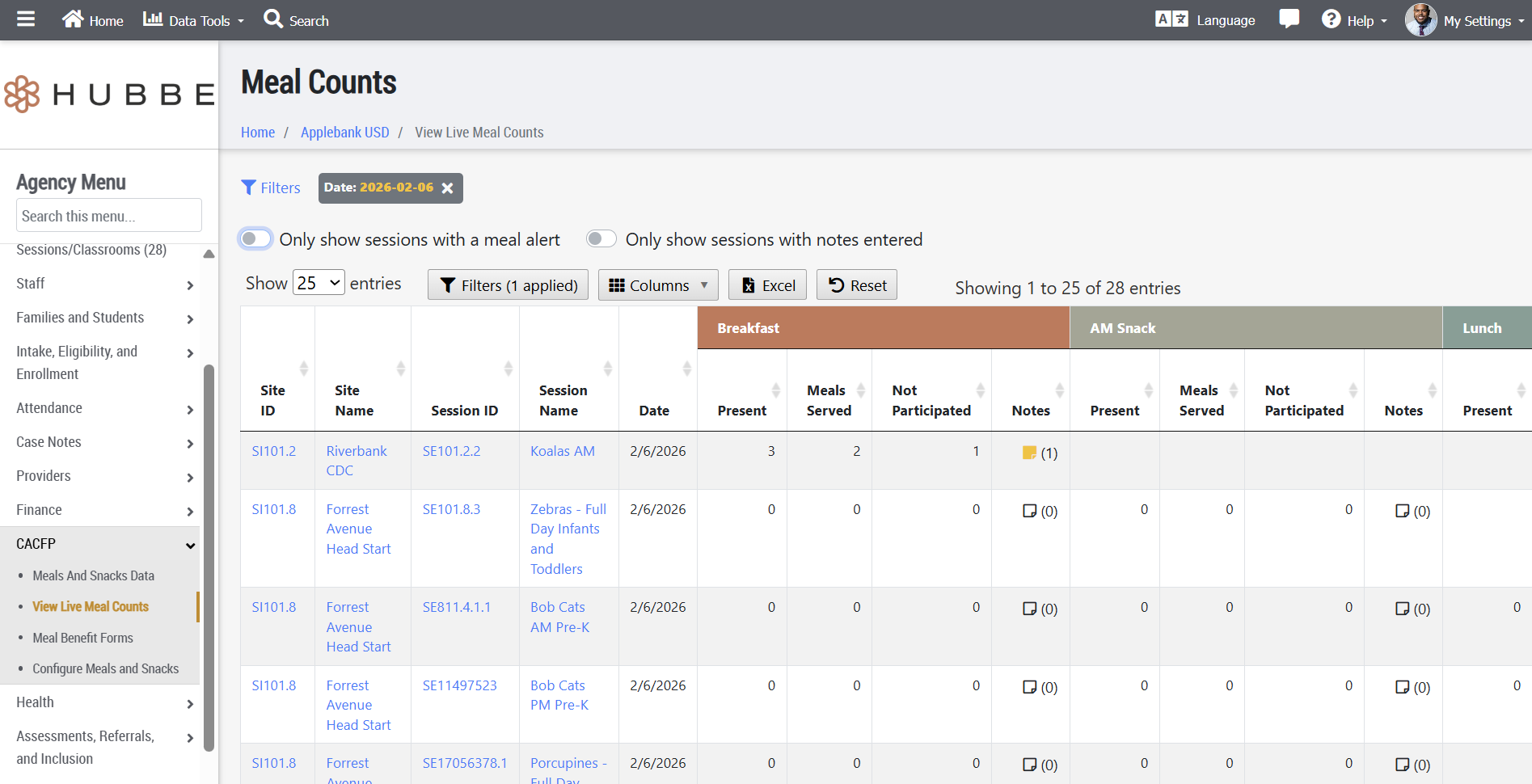 - We have updated the "View Live Meal Counts" report, available at the Agency and Site levels, to allow users to take a high level view of all sessions' meal counts at one time for any given day. The report has been transitioned to a grid view with click-able cells that allow users to view the Meal Counts modal where students are marked as Participating or Not-Participating. Any notes added to the meals served will also appear in this grid. There are various filters and two toggles at the top of the grid that allow users to easily sort for sessions that have notes or have meal alerts (such as meals served outside windows or to children who were not present). We hope this update helps your team better manage meal counts on any given day for your sessions.