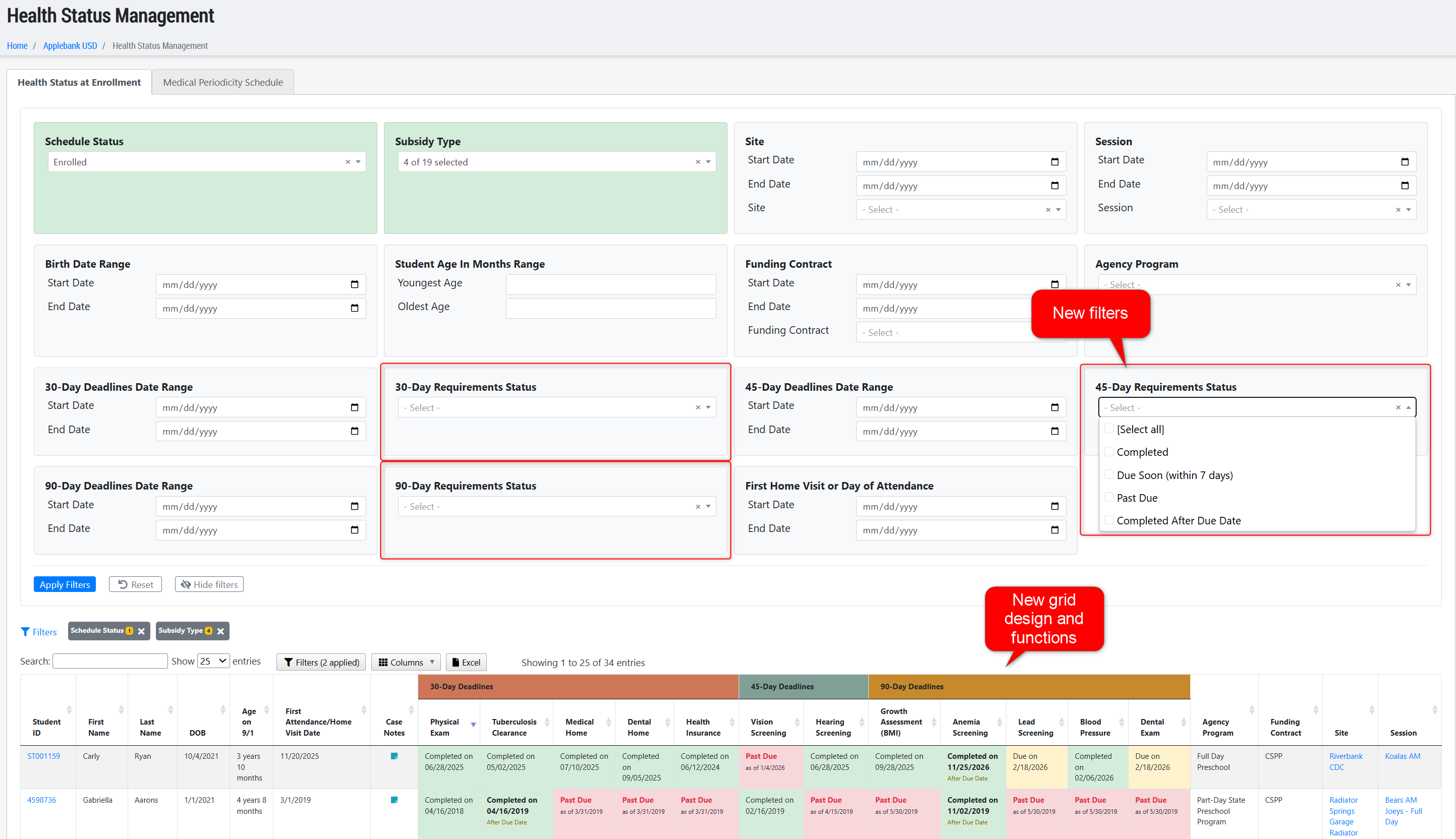 - New Filters - Added three new filters to allow users to easily sort the grid for students with 30-Day, 45-Day, or 90-Day health items that have a status of one of the following options: Completed, Due Soon (within 7 days), Past Due, or Completed After Due Date. The filters are titled: 30-Day Requirement Status, 45-Day Requirement Status, and 90-Day Requirement Status.